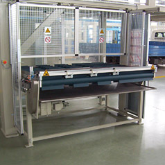 Dieses Förderband auf Basis unseres PFB 90 dient zur Ausbringung von Wellen an einer Drehmaschine. Der Achsabstand betrag 1.300 mm, die Nutzbreite 2.000 mm. Die Transportfläche wurde mit Bandstollen in Fächer unterteilt, so dass das Portal-Handling pro Fach eine Welle ablegen kann. Die Stollen wurden mehrfach unterteilt, so dass der Greifer die Möglichkeit hat, die Werkstücke bis auf den Gurt abzusetzen.