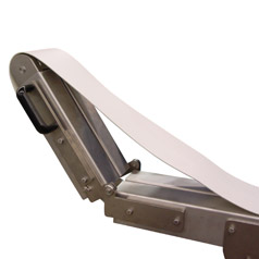 Die Schnellspannung- Einrichtung des Förderbandes wird hauptsächlich im Lebensmittelbetriebbereich eingesetzt, wo sehr häufige und intensive Reinigungsintervalle durchgeführt werden müssen. Durch einfaches Hochklappen des Rahmenstückes wird der Transportgurt so weit entspannt, dass der Förderbandkorpus und die Gurtunterseite gereinigt werden kann. Beim Zuklappen der Schnellentspannung ist der Gurt gespannt und sofort einsatzbreit, ohne längere Justier- oder Montagearbeiten.